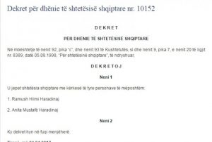 Ramush Haradinaj dhe bashkeshortja e tij Anita Haradinaj tashme do te mbajne edhe pasaporte shqiptare. Presidenti i Republikes Bujar Nishani ka firmosur dekretin qe i jep shtetesine shqiptare çiftit Hardinaj. Dekreti hyn ne fuqi menjehere.