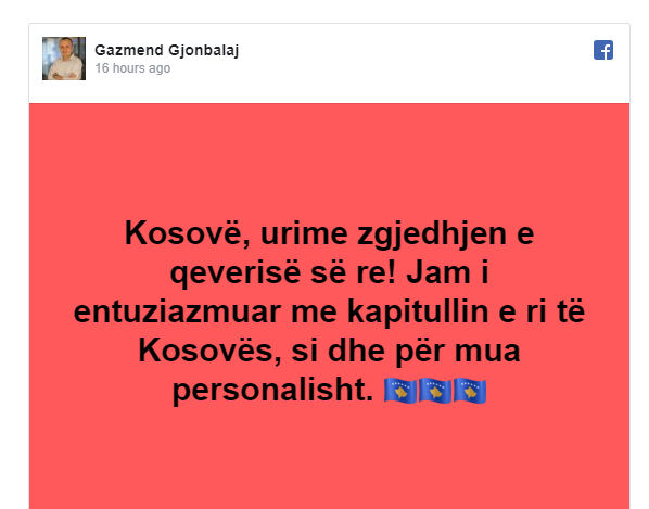 Shqiptari nga Amerika, i cili është menaxher i shumë ndërmarrjeve të njohura, Gazmend Gjonbalaj, që kishte dalë hapur për të mbështetur Albin Kurtin në zgjedhjet e 6 tetorit 2019, ka uruar Kosovën për zgjedhjen e Qeverisë së re.