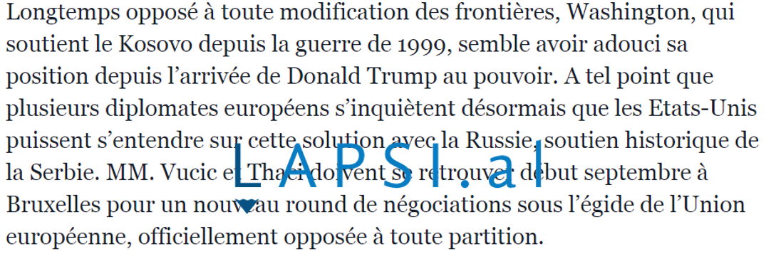 “Pas një takimi me dhëndrrin e Trump, Jared Kushner (burri i Ivanka Trump, shënim i Lapsi.al), në fund të korrikut, Daçiç pohoi se “të gjitha kartat ishin mbi tavolinë” shkruan e përditshmja franceze e referencës, e cila e komenton kështu këtë fakt: “Për një kohë të gjatë kundër çdo lloj ndryshimi të kufirit, Uashingtoni, që e mbështet Kosovën që nga lufta e 1999, duket se e ka zbutur qëndrimin pas ardhjes së Donald Trumpit në Pushtet. Kjo ka mbërritur deri në atë pikë sa shumë diplomatë europianë dyshojnë se SHBA mund të merret vesh për një zgjidhje me Rusinë, që ka qenë një mbështetse historike e Serbisë”, komentohet ë shkrimin që Lapsi.al e ka lexuar (Paragarafi në origjinal poshtë).