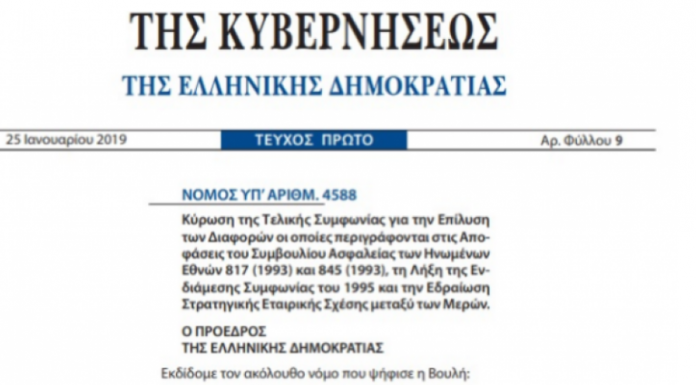 Ligji sipas të cilit ratifikohet dhe hyn në fyqi Marrëveshja e Prespës është publikuar në “Gazetën Zyrtare” të Greqisë.