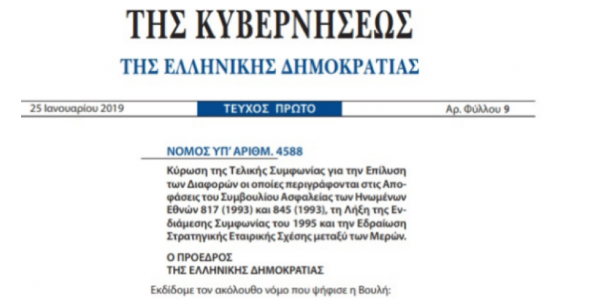 Ligji nga Ministria e Punëve të Jashtme të Greqisë me titullin “Ratifikimi i marrëveshjes përfundimtare për zgjidhjen e dallimeve siç janë sqaruar në vendimet e Këshillit për siguri të Kombeve të Bashkuara (1993) dhe 845 (1993), ndërprerja e Marrëveshjes së përkohshme nga viti 1995 dhe vendosja e partneritetit strategjik mes palëve, përmban 3 nene.