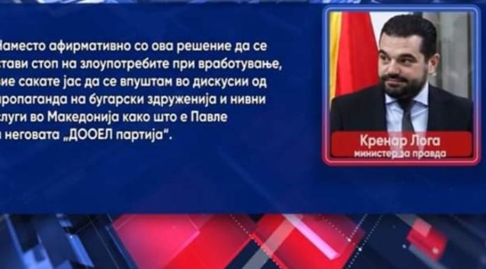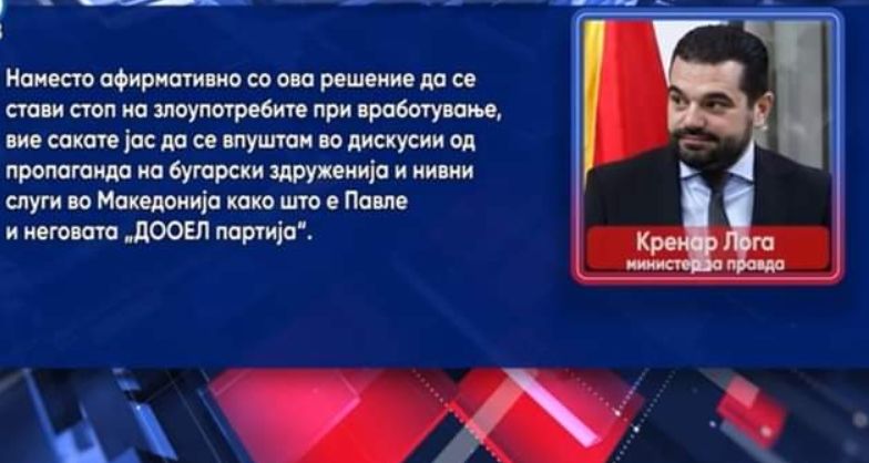 Në vend që me këtë zgjidhje t’i ndalë në mënyrë afirmative abuzimet me punësimin, ju dëshironi që unë të përfshihem në diskutime nga propaganda e shoqatave bullgare dhe shërbëtorëve të tyre në Maqedoni, si Pavle dhe “partia e tij DOOEL”. – thotë Loga