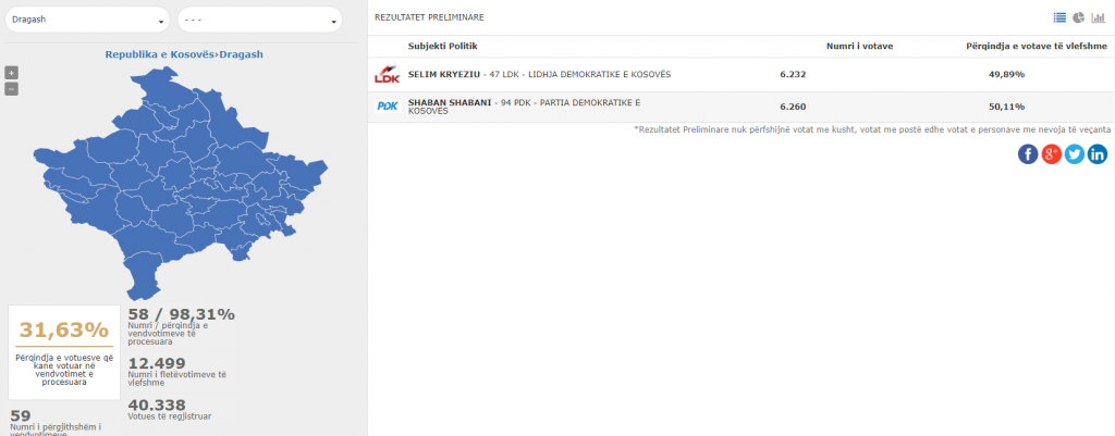 Deri më tani, kandidati i PDK’së ka 50,11 për qind, ndërsa kandidati i LDK’së ka 49,89 për qind./Periskopi