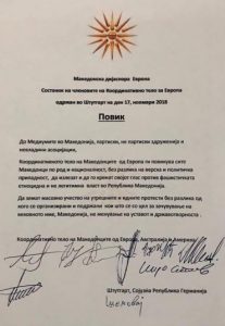 Diaspora maqedonase bën thirrje për protesta masive, për siç shprehen mbrojtjen e emrit dhe mos ndryshimin e Kushtetutës. Në kumtesën e tyre kërkohet që të gjithë maqedonasit pa dallim feje dhe përkatësie politike të dalin dhe ta ngrisin zërin kundër siç thonë ata qeverisë shkatërrimtare dhe jolegjitime të Republikës së Maqedonisë.