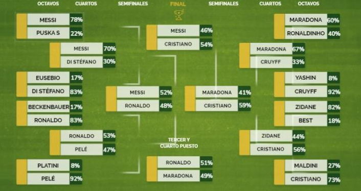 Në gjysmëfinale, ylli i Juventusit kishte eliminuar Maradonën (59% kundër 41%) ndërsa Messi mundi Ronaldo (brazilianin) me 52% të votave.