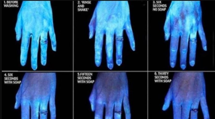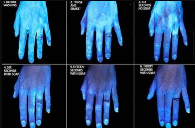 Vetëm kur individi përdor sapun nis të dallohet ndryshimi dhe duart nuk shkëlqejnë më nga mikrobet blu.