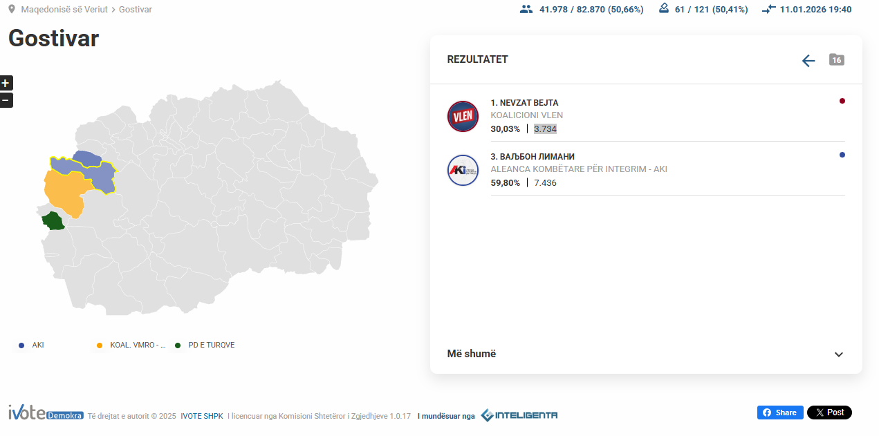 Në komunën e Gostivarit janë numëruar 50,41% të votave, ku garuan dy kandidatë, Valbon Limani nga AKI dhe Nevzat Bejta nga VLEN.