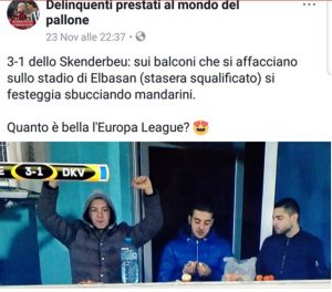 “3-1 për Skëndërbeun. Në ballkon me pamje nga stadiumi i Elbasanit duke festuar me andarina” shkruan “Deliquenti prestati al mondo del pallone”. Faqja e facebookut e cila arritu ta pikaste këtëmoment. /albeu.com/