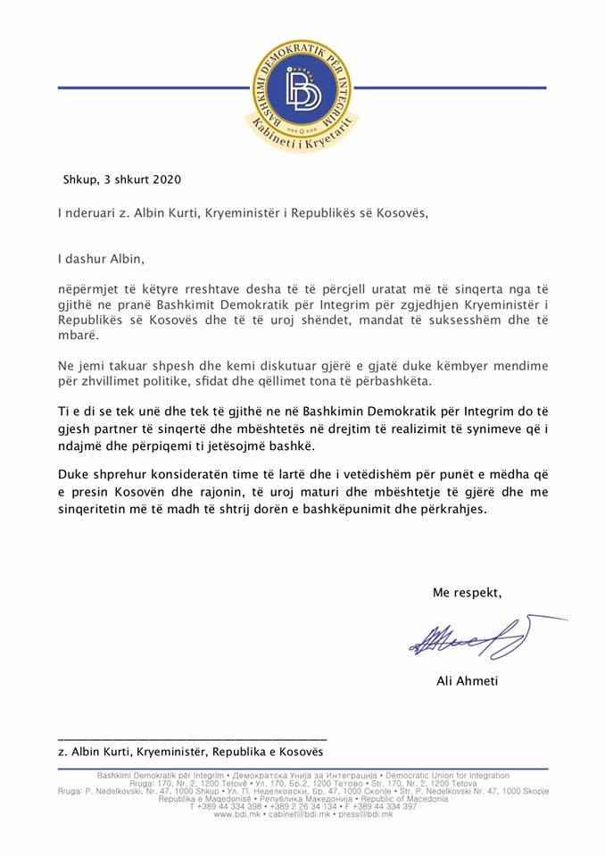 Në mesazhin e tij Ahmeti i uron Kurtit shëndet dhe një mandat të suksesshëm e të mbarë, ai i përcjell gjithashtu uratat e të gjithë anëtarëve të Bashkimit Demokratik për Integrim.