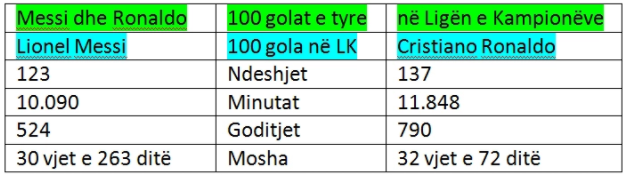 Messi dhe Ronaldo tash janë të vetmit lojtarë që kanë prekur shifrën prej 100 golash në Ligën e Kampionëve (portugezi i ka shënuar 117 gola në këtë garë deri më tani), ndërsa superylli i Barcelonës e ka arritur këtë shifër më shpejtë se rivali i tij te Real Madridit.