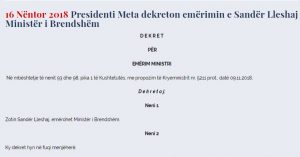 Vendimi për dekretim erdhi pas më shumë se dy javësh debate. Presidenti i Republikës së Shqipërisë, Ilir Meta ka dekretuar Sandër Lleshajn ministër të Brendshëm. Dekretimi është bërë mbrëmë në limitet e fundit të afatit kohor, duke hedhur firmën e tij 3 orë para përfundimit të afatit.