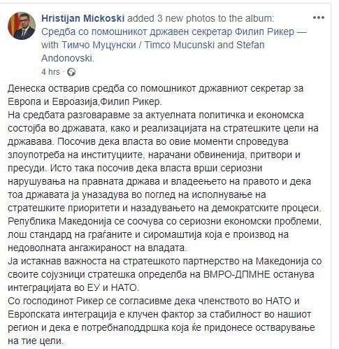 Kryetari i VMRO-DMNE-së Hristijan Mickovski sot ka takuar ndihmës-sekretarit e ardhshëm amerikan të shtetit për Evropë dhe euroazi, Filip Riker. Mickoski në profilin e tij në Faccebok ka shkruar se me Rikerin kanë biseduar për situatën aktuale në vend, për gjendjen ekonomike dhe politike të vendit. Mickoski mes tjerash gjithashtu thekson se ka shprehur shqetësimet deri tek ndihmës-sekretari i ardhshëm amerikan në lidhje me keqpërdorimet e pushtetit.