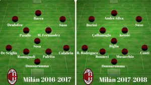 Prej lojtarëve”>lojtarëve që ishin sezonin e kaluar, vetëm dy kanë mbijetuar të jenë në formacionin e parë, portieri Donnarumma deh anësori spanjoll, Suso.