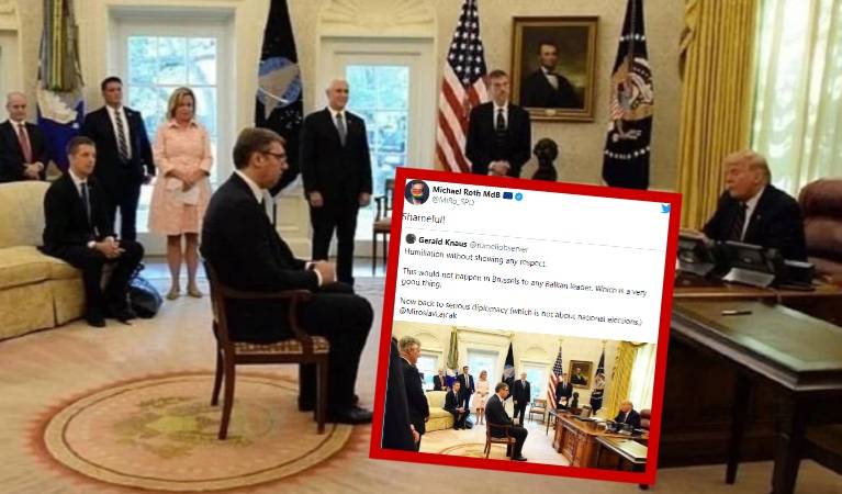 Roth ka shpërndarë në llogarinë e tij në Twitter një postim ku shihet Vuçiq i ulur përballë Trump, sipër së cilit ka shkruar “e turpshme”.