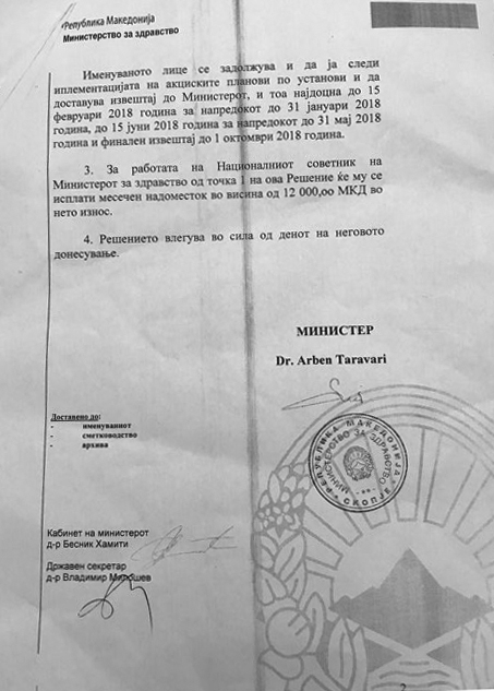Secili prej tyre do të marrë 12,000 denarë në muaj (200 euro) ose një total prej rreth 55,000 euro në vit nga buxhet. Vendimi për emërimin e Këshilltarëve Kombëtar në Ministrinë e Shëndetësisë u bë më 27 korrik, kur Ministri Taravari nuk kishte njoftuar se do të largohej nga posti ministror pasi që do të kandidonte për kryetar komune. Megjithatë, edhe nëse bëhet kryetar i komunës së Gostivarit, Taravari prej tani ka ka siguruar postin si këshillëdhënës në Ministrinë e Shëndetësië, njofton portali Sakte.net