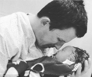 Imazhi bardhë e zi tregon Martin ‘Marty’ Tonkin me ankth në fytyrën e tij, derisa po mbante djalin e tij, duke prekur hundët e tyre, momente pas operacionit.