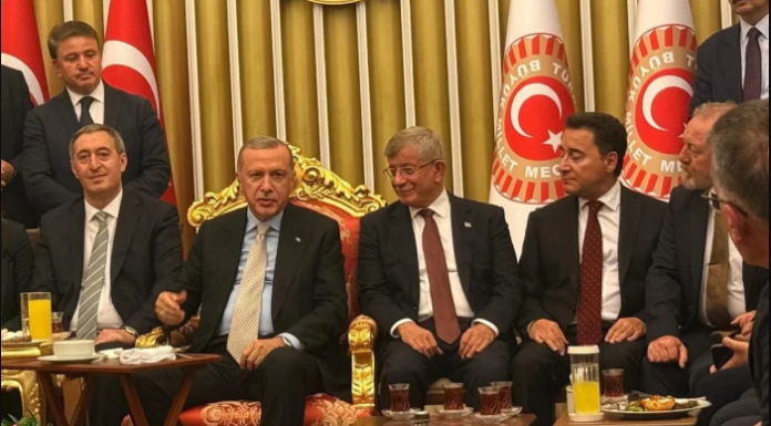 Në fotot e shpërndara në media dhe rrjete sociale, bie në sy prania e dy liderëve të rëndësishëm që dikur kishin mbajtur poste të larta në AK Parti dhe më pas kishin krijuar lëvizje të reja politike: kryetari i Partisë së Ardhmërisë, Ahmet Davutoğlu, dhe kryetari i Partisë DEVA, Ali Babacan, ishin të ulur afër Presidentit Erdoğan, përcjell TV SHENJA.