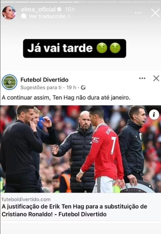 Duke postuar në rrjetet sociale, Elma Aveiro postoi një fotografi të një artikulli të titulluar, “Justifikimi i Erik Ten Hag për zëvendësimin e Cristiano Ronaldos”, me mbishkrimin, “Është shumë vonë”, së bashku me disa emoji të fytyrës së sëmurë.