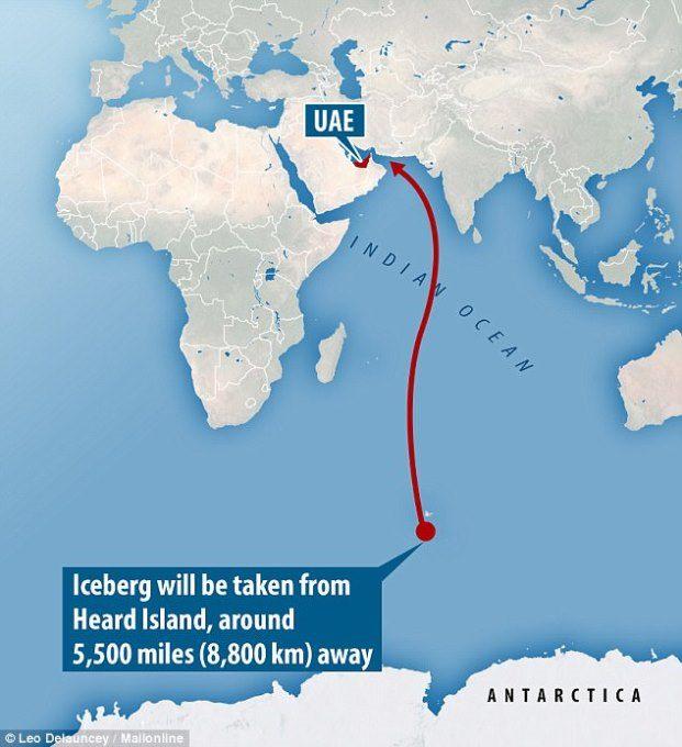 Byroja Kombëtare e Këshilltarëve, me seli në Masdar City, Abu Dabi, po planifikon të krijojë blloqe masive të akullit nga Heard Island, rreth 600 kilometra largbregdetit të Antarktidës. Më pas, ajo do t’i transportojë për rreth 5,500 milje (8,800 km) në Fujairah, një nga shtatë emiratet që përbëjnë Emiratet e Bashkuara Arabe.