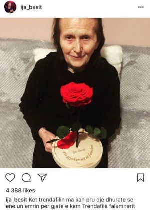 “Kët trëndafilin ma kan pru dje dhuratë se ene un emrin për gjatë e kam Trëndafile falemnerit!”-ka shkruar gjyshja e aktorit në postim, duke zbuluar kështu se emri i saj i vërtetë është Trëndafile.