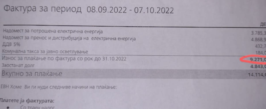 Kjo që po shihni është fatura e një mërgimtari nga Kërçova, i cili me gjithë familjen jeton në Zvicër, ndërsa për periudhën 8 shtatori-7 tetor fatura e rrymës i ka ardhur 9271 denar. Ai thotë se këtë kohë as nuk kanë qenë në shtëpinë e tyre në Kërçovë, ndërsa Numrat e KW/orë në faturë nuk korrespondojnë me ato të orëmatësit të cilat i ka fotografuar përgjegjësi që kujdeset për shtëpinë e tyre.