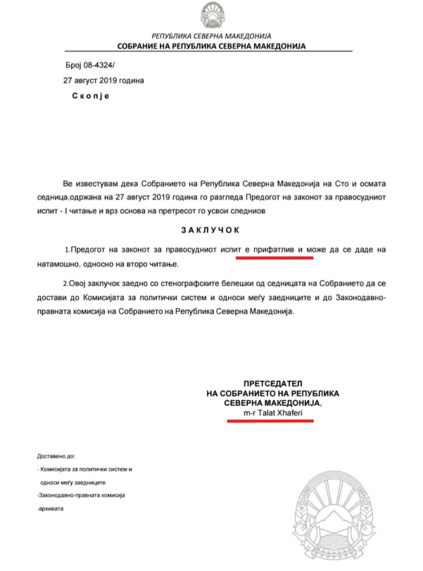 Sipas Nesimit, më 27 gusht 2019, Xhaferi ka nënshkruar dokumentin që shpall Ligjin për provimin e jurisprudencës si të pranueshëm, edhe pse në atë ligj nuk ishte përfshirë e drejta që provimi të jepet edhe në gjuhën shqipe. “Në momentin e nënshkrimit të këtij dokumenti, Ligji për përdorimin e gjuhëve veç më ka qenë në fuqi dhe dispozitat e gjuhës shqipe është dashur patjetër të përfshihen”, ka shkruar Nesimi.