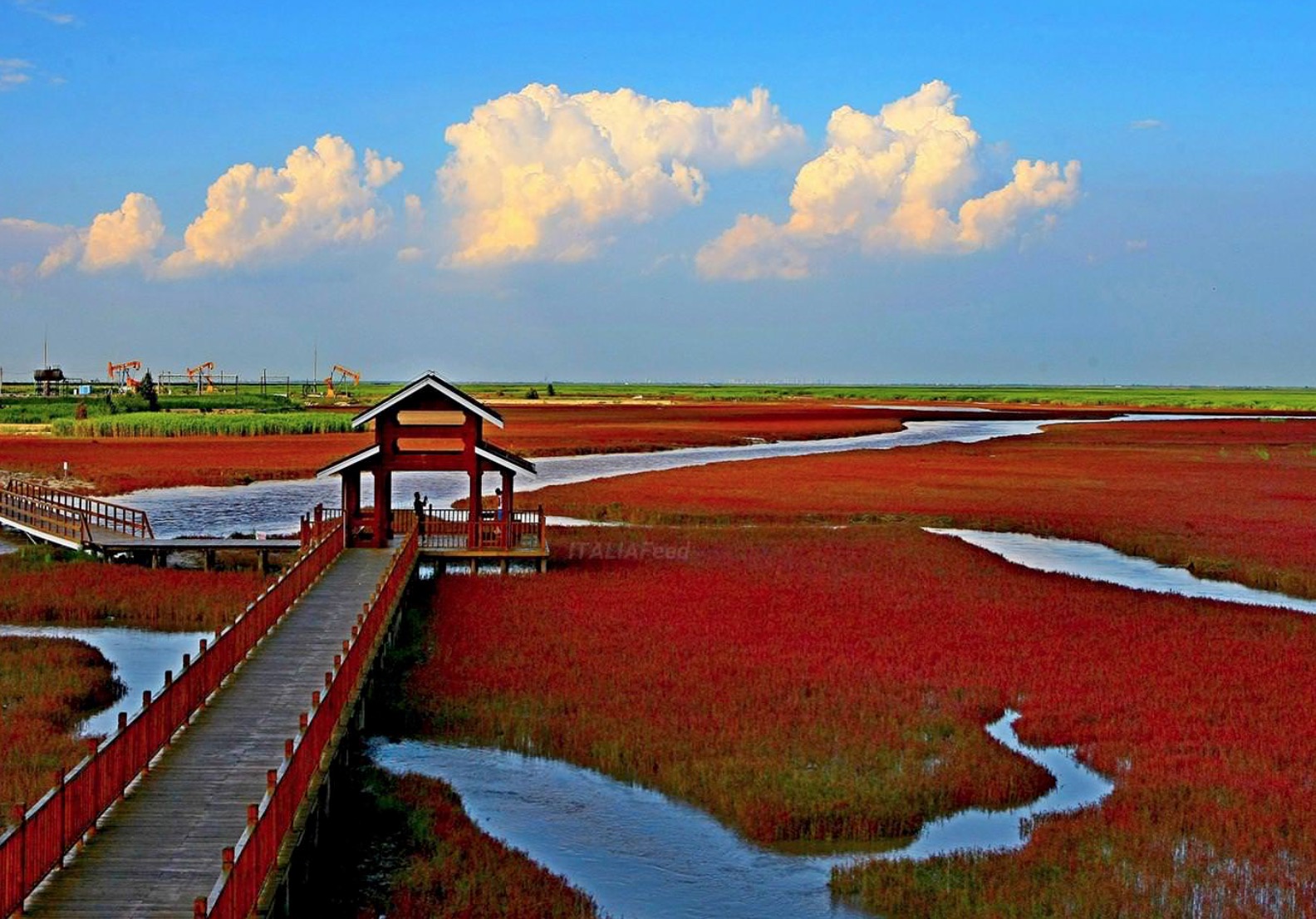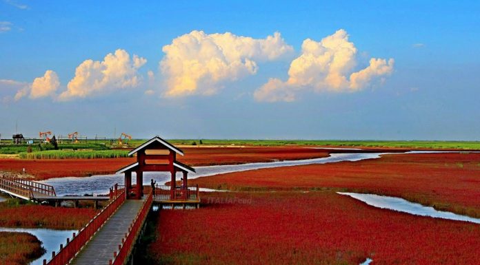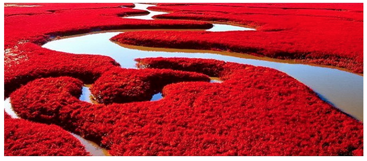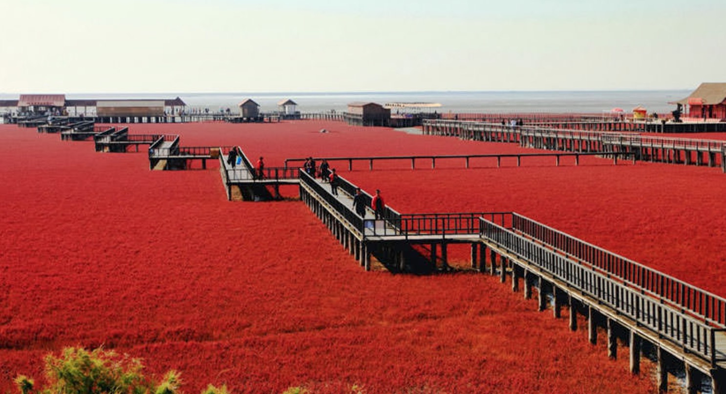 Ky plazh ndodhet rreth 30 km në juglindje të qytetit të Panjinit. Në lagunat e deltës së lumit Liao, që ndodhet në Kinë dhe që është lumi kryesor i Mançurisë jugore. Ky mjedis natyror është një vend unik, sepse në vjeshtë ai mbulon të gjithë gjerësinë e tij, rreth 3.500 hektarë, me një ngjyrë të kuqe intensive.