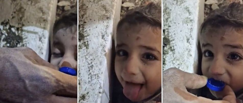 Anëtarët e ekipit të shpëtimit i dhanë ujë vogëlushit me kapakun e shishes, ndërkohë në video shihet teksa i vogli buzëqesh pasi piu ujë.
