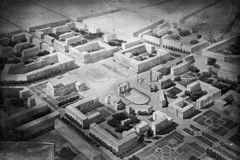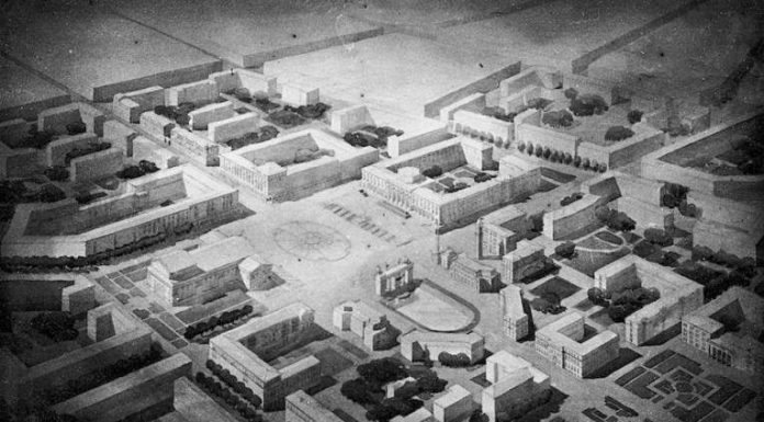 “Version i qendrës së Tiranës me shesh kuadratik sikurse ai sot dhe me një Teatër të Operas në anën perëndimore të tij. Një portë triumfi mbyll perspektivën e gropës së lulishtes. Ky projekt që veç Bashkisë së vjetër prishte edhe Bankën e Shtetit me Teatrin Kombëtar, si dhe ish-godinen e Parlamentit (Teatrin e Kukullave), nuk u realizua në asnjë element të tij”, shkruan Shkreli.