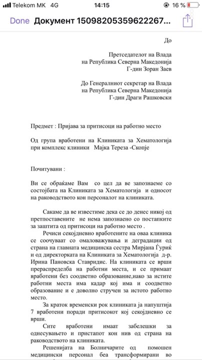 Përmes një letre dërguar sekretarit të Qeverisë dhe kryeministrit Zoran Zaev të punësuarit në klinkën për Hematologji në spitalin “Nënë Tereza” kanë njoftuar se ndaj tyre po ushtrohet presion.
