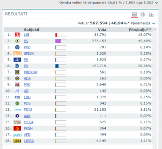 Numërohen 1963 nga 5362 kuti ne rang kombëtar. Nga numërimi i deritanishem rezulton se Partia Socialiste kryeson me shumicë votash. PS i rrembeu nje mandat PDIU ne Diber, ndersa PD-ja i mori mandatin cameve ne Tirane.