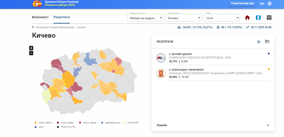 Sipas 73% të votave të numëruara nga ana e KSHZ prin kandidati i VMRO-së, Aleksandar Jovanovski me 10,587 mijë vota, ndërsa kandidati i AKI-së, Fatmir Dehari me 8,385 mijë vota, transmeton InfoShqip.
