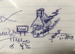 Në këtë vizatim mund të shihen të shtënat masive në shkollën që është përfshirë nga zjarri, derisa njerëzit që ikin qëllohen me revole nga një burrë, transmeton Telegrafi.