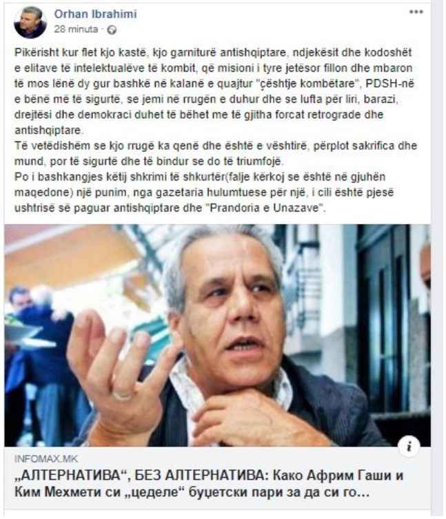 Të vetëdishëm se kjo rrugë ka qenë dhe është e vështirë, përplot sakrifica dhe mund, por të sigurtë dhe të bindur se do të triumfojë. Po i bashkangjes këtij shkrimi të shkurtër(falje kërkoj se është në gjuhën maqedone) një punim, nga gazetaria hulumtuese për një, i cili është pjesë ushtrisë së paguar antishqiptare dhe “Prandoria e Unazave”, theksoi Ibrahimi.