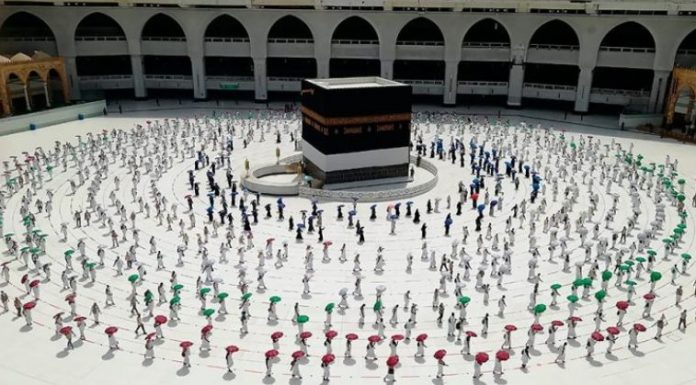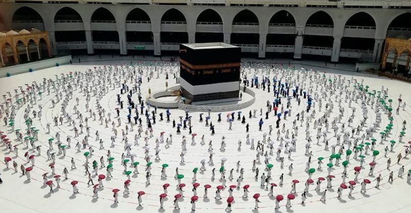 Besimtarët myslimanë detyrohen të mbajnë distancën sociale fizike derisa qëndrojnë pranë xhamisë madhështore të Mekës.
