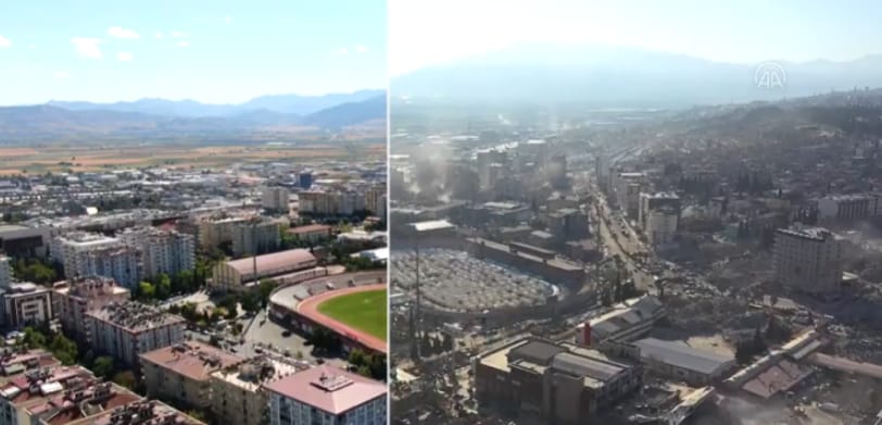 Pamjet ajrore të marra në Kahramanmaras, epiqendra e tërmetit në Turqi, të rrugëve të ngarkuara të qytetit para dhe pas katastrofës zbuluan shkallën e shkatërrimit.