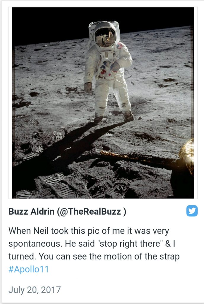 “Kur Neil më fotografoi këtu, ishte shumë spontane. Ai tha ndalo dhe kthehu, unë u ktheva,kjo mund të shihet edhe nga lëvizja e litarit të sigurisë.“-shkruan Aldrin në profilin e tij në Twitter./InfoShqip.com