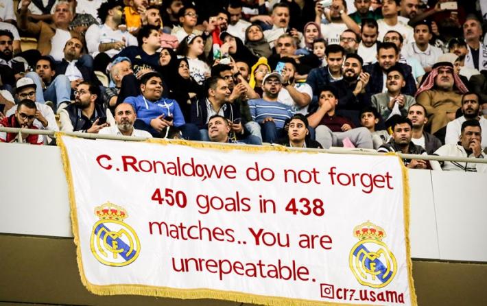 Në shkallët e stadiumit “Mbreti Abdullah” në Arabinë Saudite, një grup tifozësh madrilenë shpalosën banderolën e “dashurisë” së pakursyer për futbollistin e Juventusit.