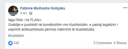 Kollcaku ka shkruar në Facebook se është duke u bërë grabitje e pushtetit në kundërshtim me Kushtetutën. Ajo thotë se pastaj do të bëhet legalizim i i veprimit antikushtetues përmes ndërrimit të Kushtetutës.
