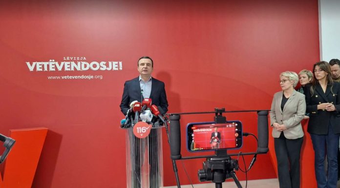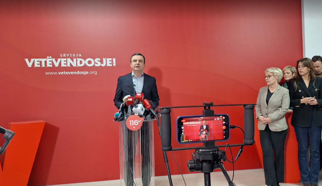 Kryetari i LVV-së, Albin Kurti, në konferencën e tij të parë pas mbylljes së vendvotimeve dhe publikimit të rezultateve preliminare nga KQZ, të cilat e vendosin partinë e tij të parën me gati 50% të votave të fituara.