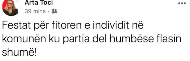 Një deklaratë e Arben Taravarit pas përfundimit të procesit zgjedhor kur tha se sipas informacioneve nga shtabet tona, ne jemi në epërsi të madhe dhe presim fitore bindëse, kaq ka mjaftuar që ai të ketë reagime nga ana e bashkëpartiakëve të tij më të ngushtë siç është znj. Arta Toçi. Ajo përmes një postimi në rrjetin social facebook thotë se: “Festat për fitoren e individit në komunën ku partia del humbëse flasin shumë!”