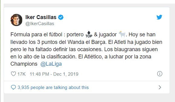 “Formula për futboll: Portieri 🔝(top) & lojtari 🐐 (GOAT). Sot, Barça i mori të tri pikët në Wanda Metropolitano. Atletico luajti mirë por i mungoi qetësia dhe pasimi i duhur para golit. Blaugrana mbetet në krye të ligës. Atletico duhet të luftojë për zonën Champions”, shkroi Casillas në Twitter, duke lënë të kuptohet se ai mendon se Messi është më i miri i të gjitha kohëve.