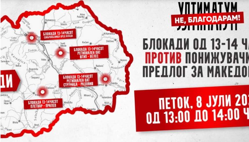 Bllokada në mbarë vendin nga nesër në orën 13.00 ka paralajmëruar sonte VMRO-DPMNE para Kuvendit, ku ka protestuar për të gjashtën ditë radhazi kundër propozimit francez për heqjen e vetos bullgare dhe zhbllokimin e integrimeve evropiane të Maqedonisë.