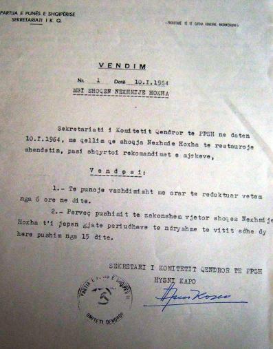 Pas vendimit të vitit 1958 për kufizimin e punës së diktatorit, në vitin 1964 u mor një tjetër vendim për kufizimin e punës së bashkëshortes së tij.