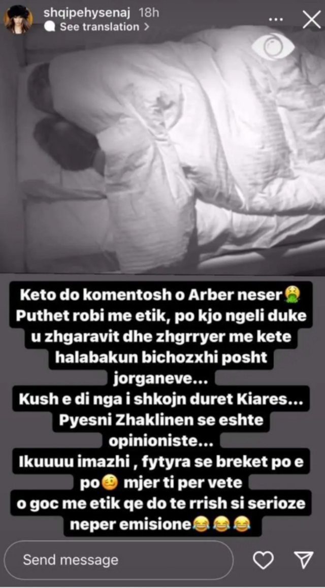 MagazinaShowBiz Personazhi i njohur i Top Channel bën për dy lekë Kiarën: Ngeli duke u zhgarravit poshtë jorganëve 17:27 / 07.04.2023 Shqipe Hysenaj ka komentuar afirmitetin e Kiarës me Luizin. Përmes një storie në Instagram, ajo është shfaqur e revoltuar. Ndër tjera, Shqipja thotë se Kiara po zhgarravitet me Luizin, iku imazhi thotë ajo. FOTO: