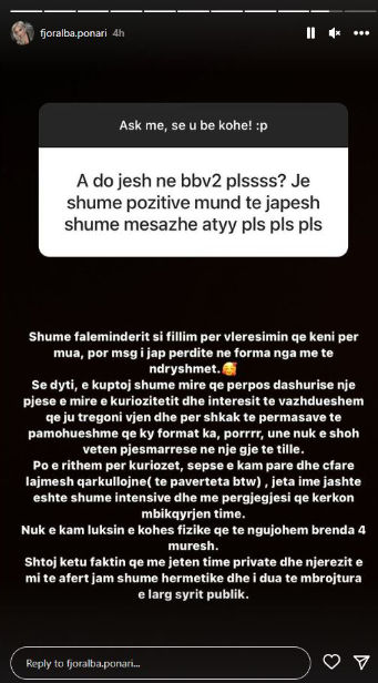 Ndër të tjera, dikush e ka pyetur moderatoren nëse ajo do të jetë pjesë e “Big Brother VIP” dhe ajo ka thënë ‘jo’, duke theksuar se ka një jetë shumë intensive dhe nuk e ka luksin e kohës që të ngujohet brenda 4 mureve.