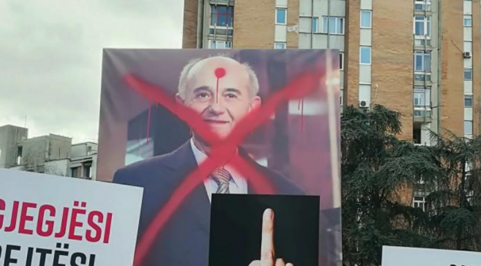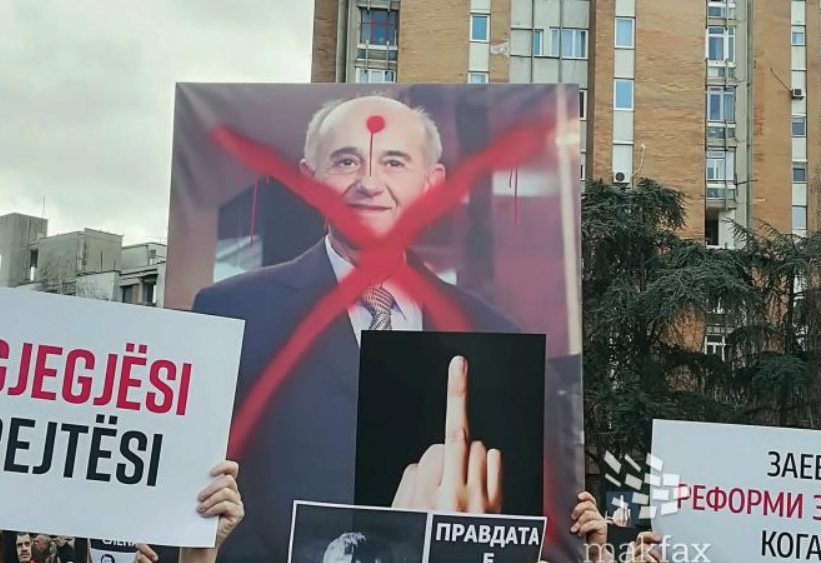 Shqiptarët që sot protestojnë për rastin Almirit kanë kryqëzuar Kryeprokurorin Jovevski dhe i kanë vendosur një “plumb në ballë”.