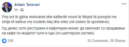 “Prej sot të gjitha restoranet dhe kafiteritë mund të fillojnë të punojnë me shitje të kafeve me modelin blej dhe shko (në sistem të sporteleve)”, shkruan kreu i Gostivarit, Arben Taravari.
