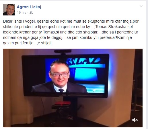 “Më pëlqen të shoh komedi ose të dëgjoj muzikë, sepse më pëlqen të jem i lumtur. Është një aktor komik shqiptar i cili më pëlqen shumë. Quhet Agron Llakaj”. Këtë çast Llakaj e ka publikuar në profilin e tij në Facebook duke shkruar: “Dikur ishte i vogel, qeshte edhe kot me mua se skuptonte mire cfar thoja,por shikonte prinderit e tij qe qeshnin qeshte edhe ky….,Tomas Strakosha sot legjende,krenar per ty Tomas,si une dhe cdo shqiptar…,dhe sa i perkedhelur ndihem qe nga goja jote te degjoj….se jam komiku yt i preferuar! Kam nje gezim prej femije…,e shijoj!,”-përfundon Llakaj në shkrimin e tij./Gazeta Express