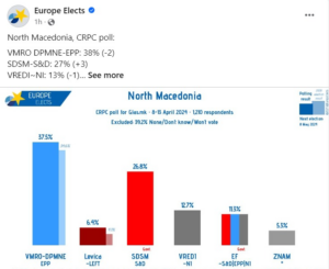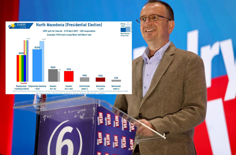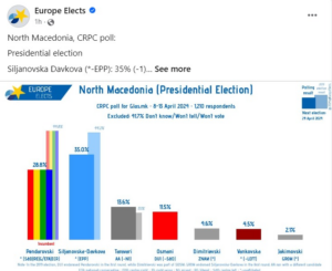 Organizata prestigjioze franceze e sondazheve të lidhura me zgjedhjet në vendet evropiane dhe më gjerë “Europe Elects” publikoi anketën e Qendrës për Kërkime Politike dhe Komunikim (CRPC) në bashkëpunim me Shoqatën për gazetari, informim, komunikim dhe shërbime të marketingut “Глас на вистината”e cila realizoj anketën e dytë në prag të zgjedhjeve Presidenciale 2024.